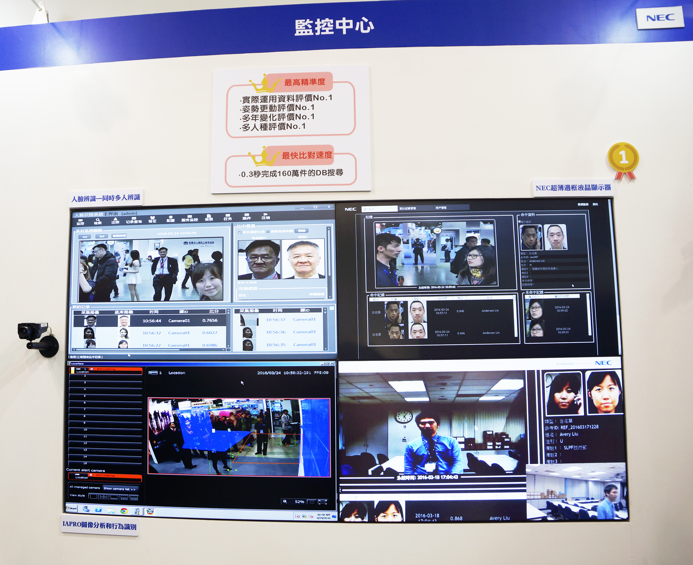 2016智慧城市展在3月22日~3月25日於南港展覽館盛大展開,台灣NEC此次以人臉辨識為主,在智慧城市展展出多項解決方案,獲得來場貴賓的一致好評。在3月23日,台灣NEC也參與展場內的「智慧安防論壇」,由NEC Solution Platform事業群資深PRESALES專家林漢坤發表〈大規模臉部辨識運用於全景影像監控系統〉。NEC已長期耕耘人臉辨識技術領域超過40年,並在世界各國累積了許多成功實績。值得一提的是,NEC的人臉辨識技術,可在0.3秒內比對160萬人以上的臉部資料,更連續3次榮獲美國國家標準與技術研究院(National Institute of Standards and Technology,NIST)評比為全球第一。無論是實際應用、姿勢更動、年齡變化、甚或針對不同人種進行辨識,NEC人臉辨識技術具備傲視業界的最高精準度。